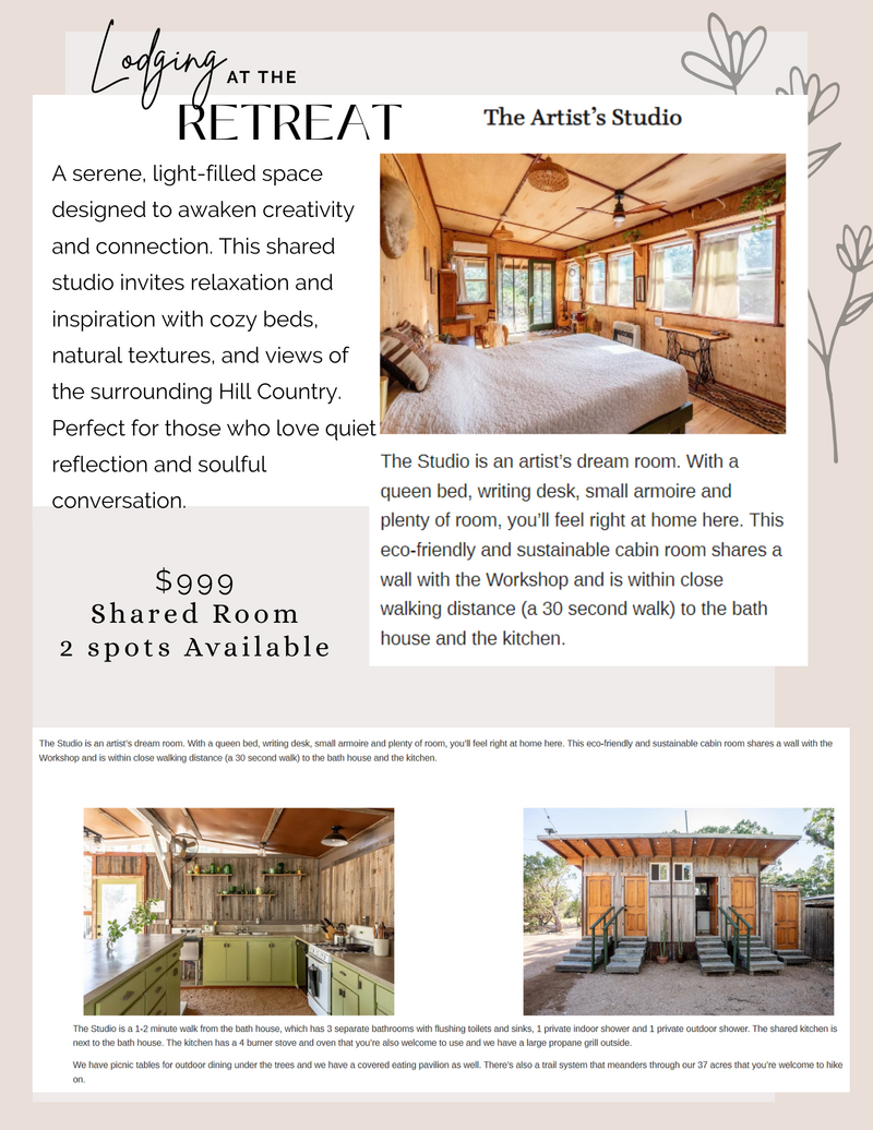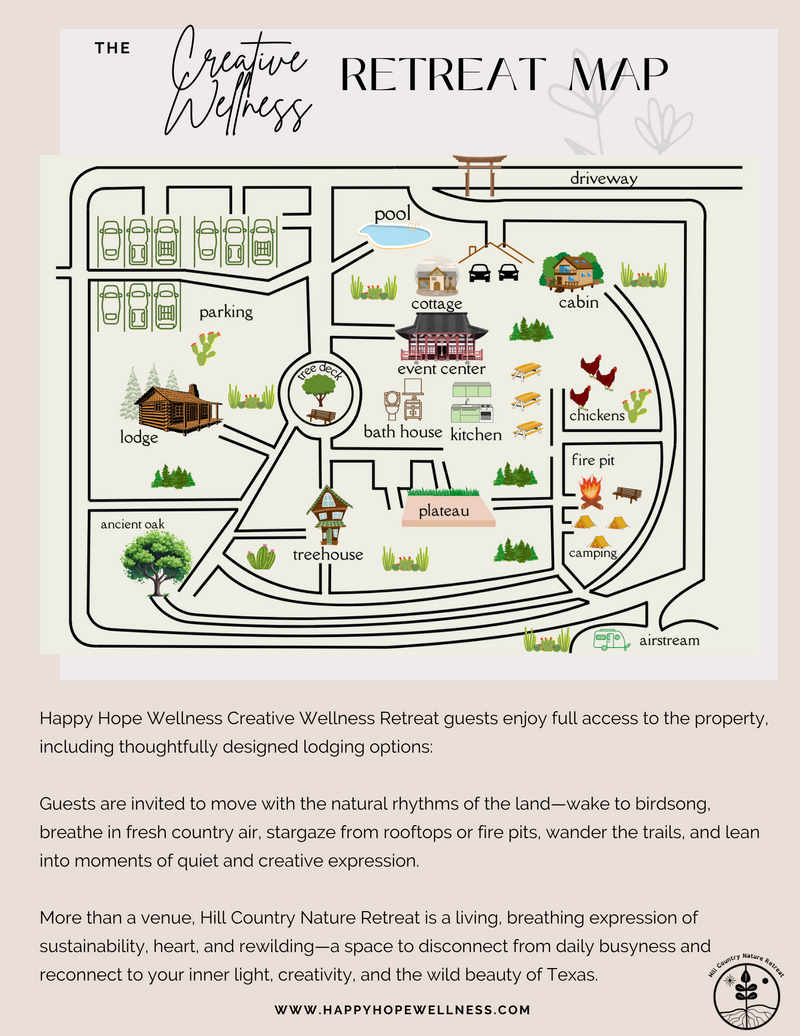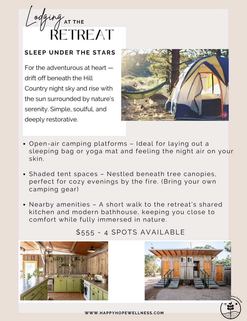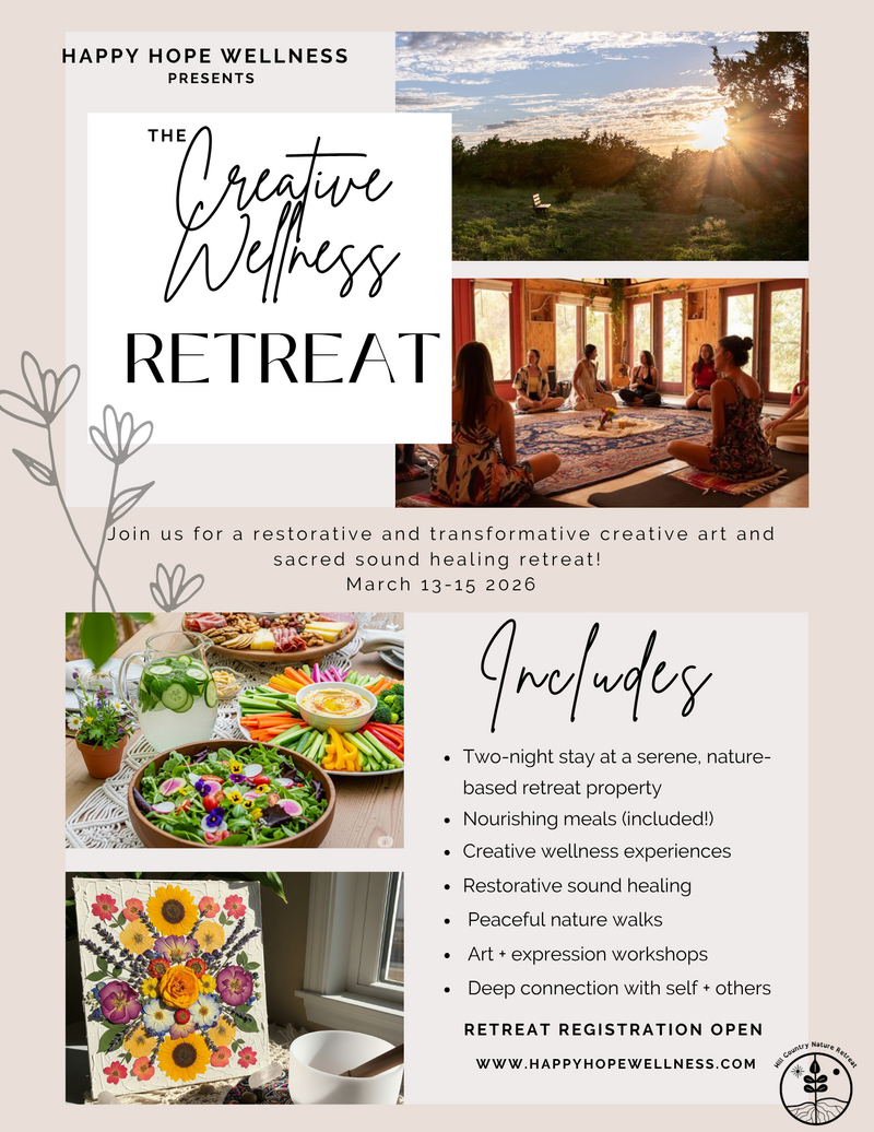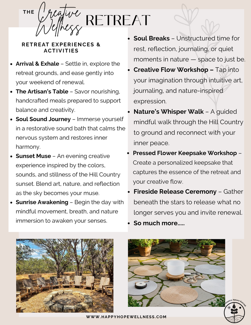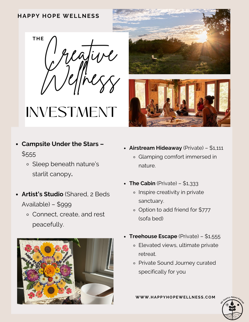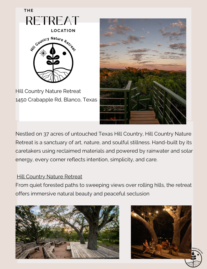Escape to the serene beauty of the Texas Hill Country for a transformative three-day retreat designed to nourish your mind, body, and spirit. Surrounded by rolling hills, fresh air, and nature’s tranquility, this immersive experience combines creative expression, sound healing, and mindful wellness practices in a supportive, uplifting community.